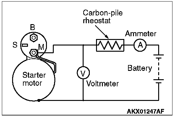 2. Connect a test ammeter (100-ampere scale) and carbon pile rheostat in series between the positive battery terminal and starter motor terminal.