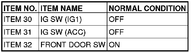 Normal condition is not displayed for "FRONT DOOR SW" : Refer to Inspection Procedure M-5 "ETACS-ECU does not receive any signal from the door switches Inspection Procedure M-5."
