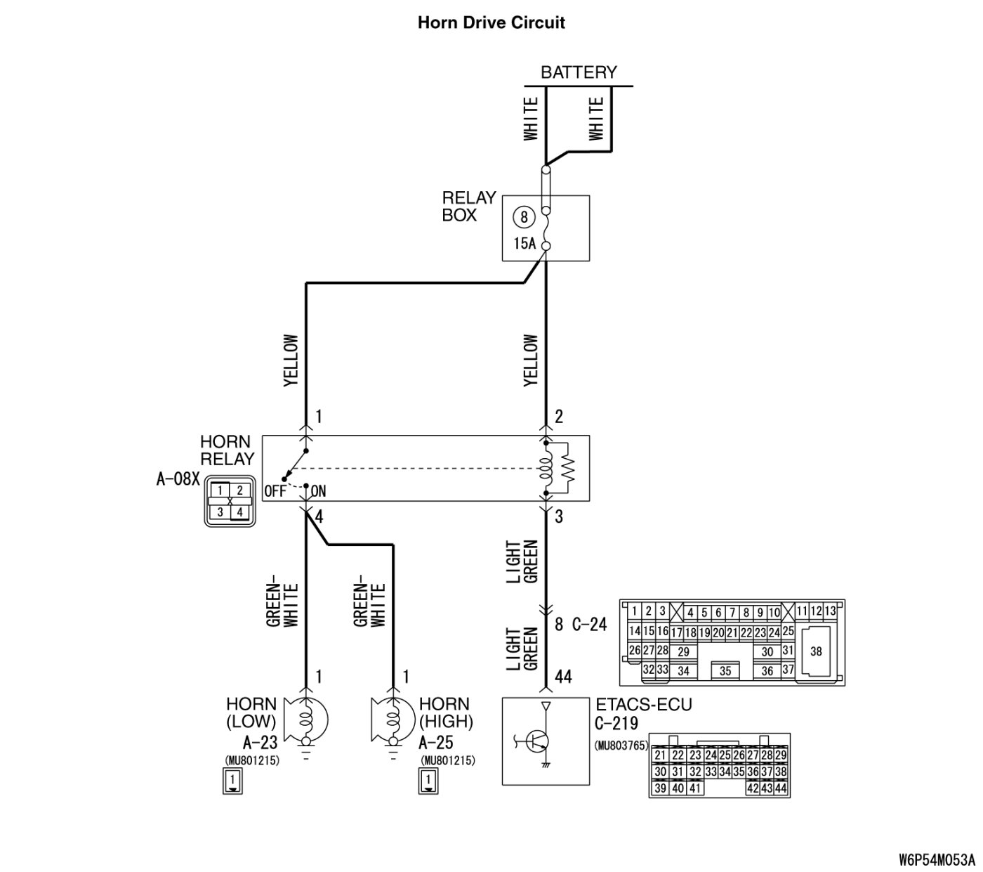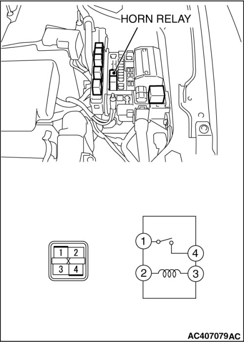 (1)Disconnect horn relay and measure the voltage available at the relay box side of the connector.