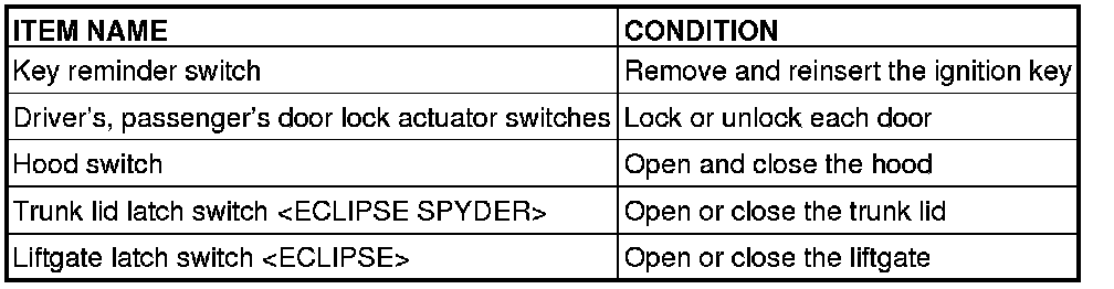 Q. When the key reminder switch, door lock actuator, door look key cylinder switch, hood switch, trunk lid latch switch[ ECLIPSE SPYDER] and liftgate latch switch[ ECLIPSE] are operated, does scan tool MB991958 sound in all cases?