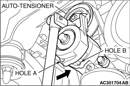 2. Rotate the auto-tensioner counterclockwise and align hole A with hole B.