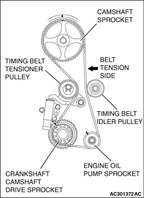 Install the valve timing belt. Then apply reverse rotation (counterclockwise rotation) pressure to the cam shaft sprocket. Re-check to see that each timing mark is aligned while the tension side of the belt is right.