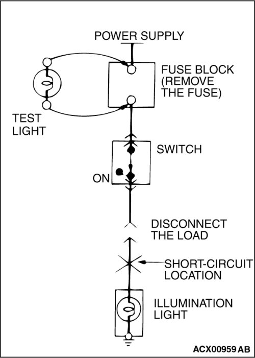 Because the fuse has blown, it is probable that there is a short circuit. Follow the procedures below to narrow down the short-circuit location.