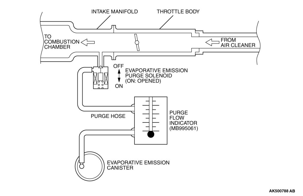 1. Disconnect the purge hose from the evaporative emission (EVAP) purge solenoid, and connect special tool MB995061 between the EVAP purge solenoid and the purge hose.
