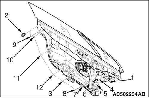 When loosening the door window glass mounting bolts, use a magnetic wrench to prevent bolts from dropping into the door window module assembly cavity.