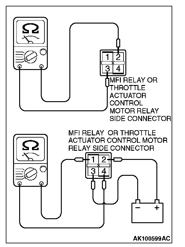MULTIPORT FUEL INJECTION (MFI) RELAY AND THROTTLE ACTUATOR CONTROL MOTOR RELAY CONTINUITY CHECKInspect the MFI relay and throttle actuator control motor relay for continuity in accordance with the chart shown below.