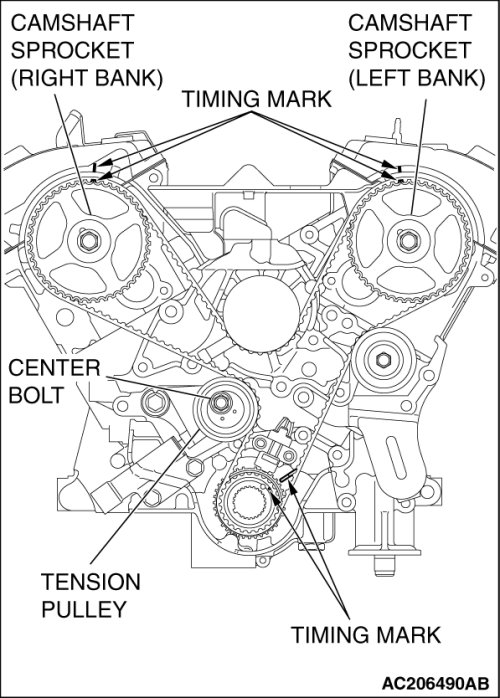 3. Turn the camshaft sprocket (Right bank) counterclockwise until the tension side of the timing belt is firmly stretched. Check all the timing marks again.