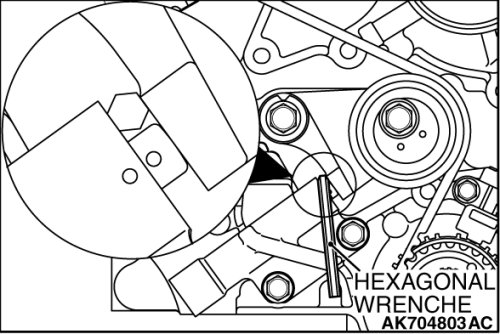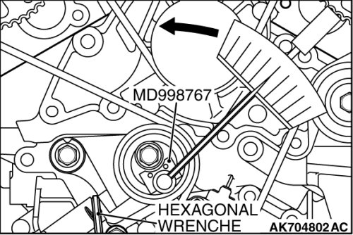5. Inserting the hexagonal wrench, use special tool MD998767 to push the tensioner pulley into the timing belt, then temporarily tighten the center bolt.
