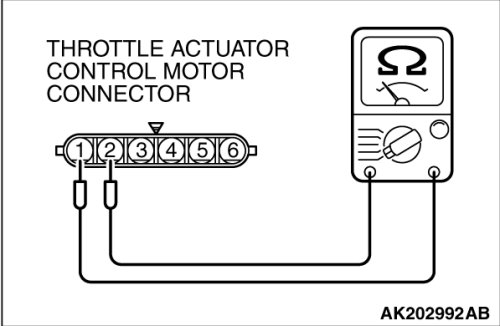 If the measured resistance deviates from the standard value, fully open the throttle valve with your finger more than five times, then check the result again. If the throttle actuator control motor is not used for an extended period of time, the resistance may be increased as a result of internal forming of oxide film. Therefore, it means that the oxide film can be removed through a self cleaning capability of the throttle actuator control motor, if forcibly moved.