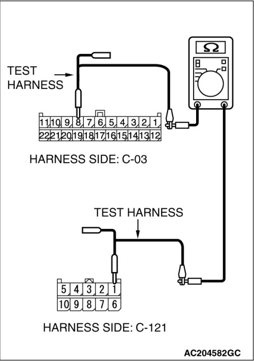 (2)Disconnect joint connector (3) C-03 and TPMS receiver connector C-121, and measure the resistance between the wiring harness side connector of TPMS receiver connector C-121 and joint connector (3) C-03.