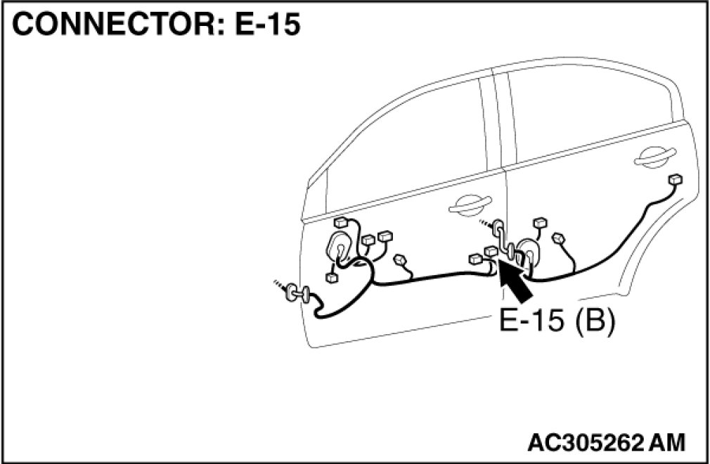 (1)Disconnect front door lock actuator (LH) connector E-15 and measure the resistance available at the wiring harness side of the connector.