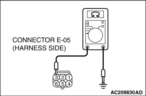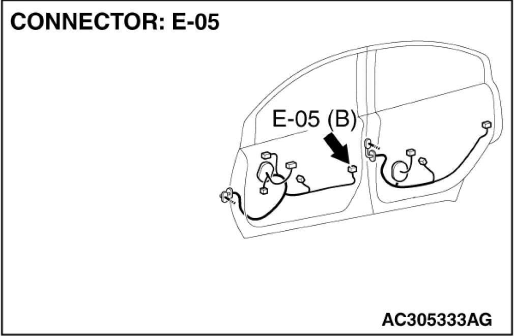 (1)Disconnect front door lock actuator (RH) connector E-05 and measure the resistance available at the wiring harness side of the connector.