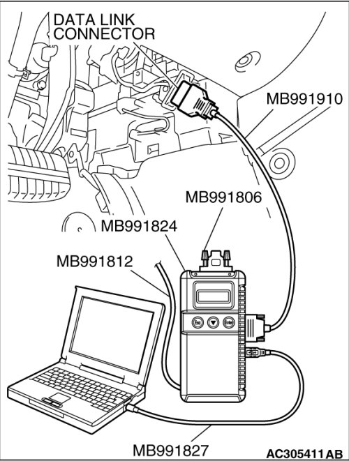 To prevent damage to scan tool MB991958, always turn the ignition switch to the "LOCK" (OFF) position before connecting or disconnecting scan tool MB991958. Connect special tool MB991910 before connecting special tool MB991812. Be sure to connect special tool MB991806 after turning on special tool MB991824.