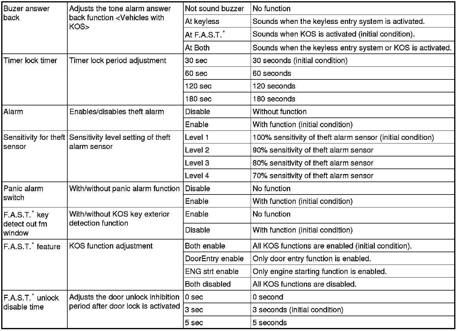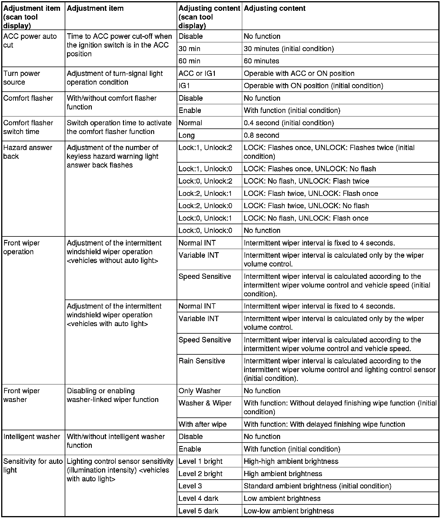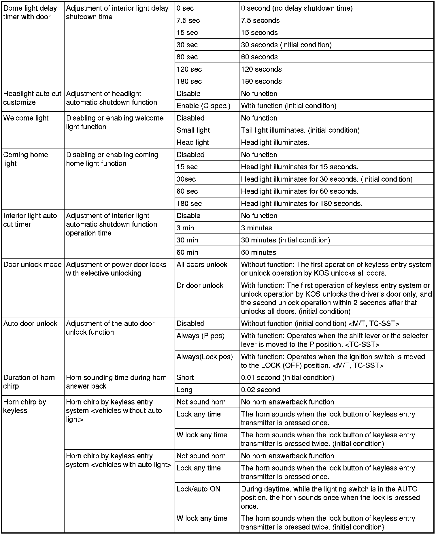 By operating the ETACS system or MMCS of scan tool MB991958, the following functions can be programmed. The programmed information is held even when the battery is disconnected.