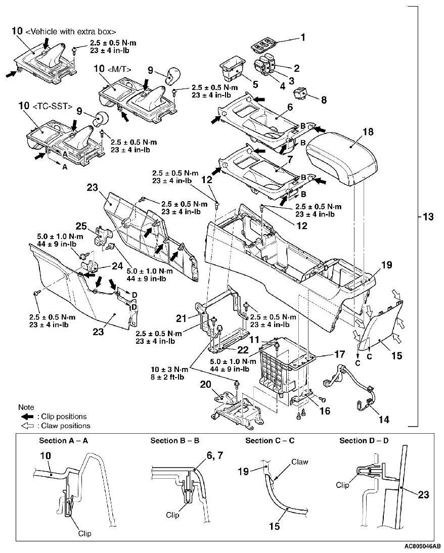 Floor console rear ends (shown in the dotted lines) may damage when removing the floor console cover. You can neglect this damage and floor console rear is reusable.
