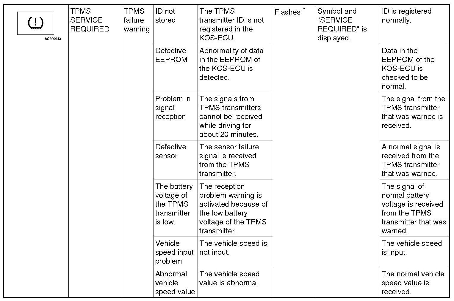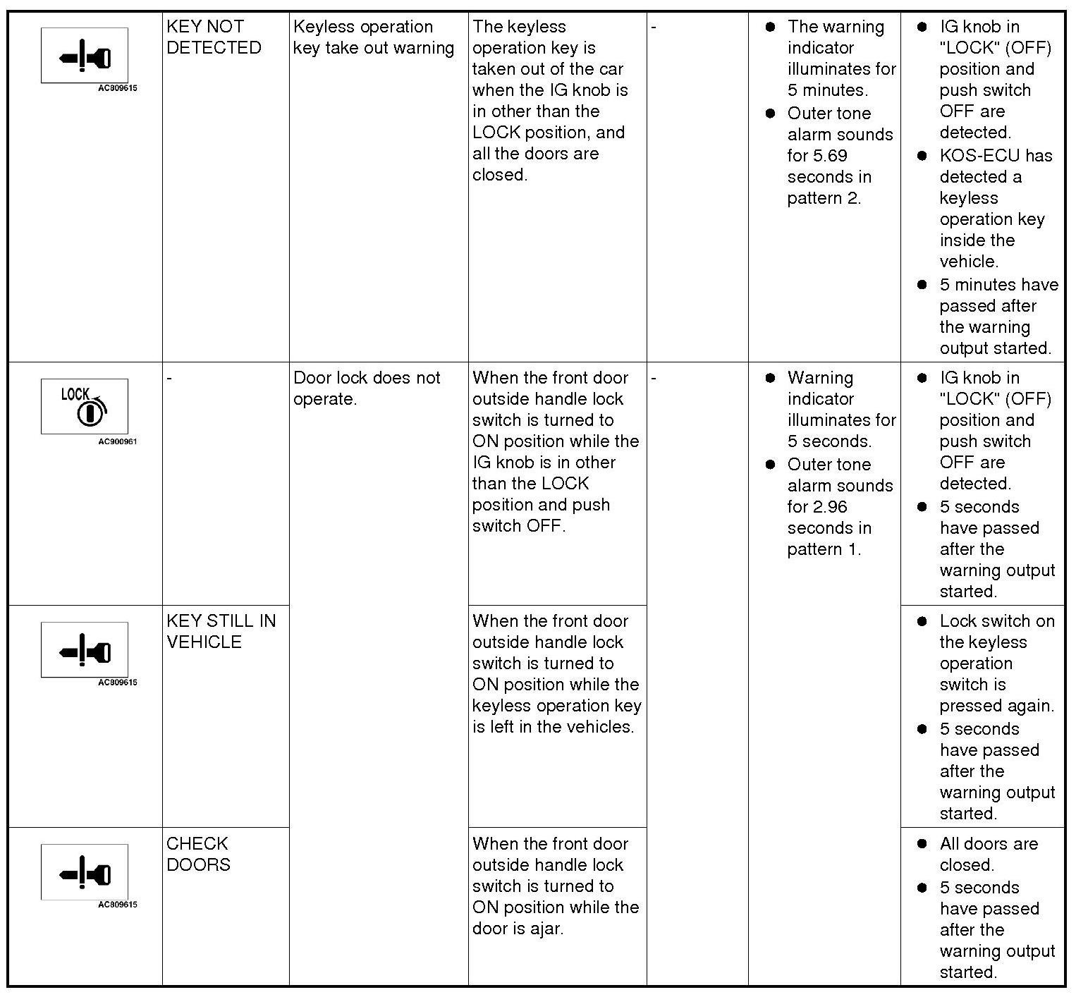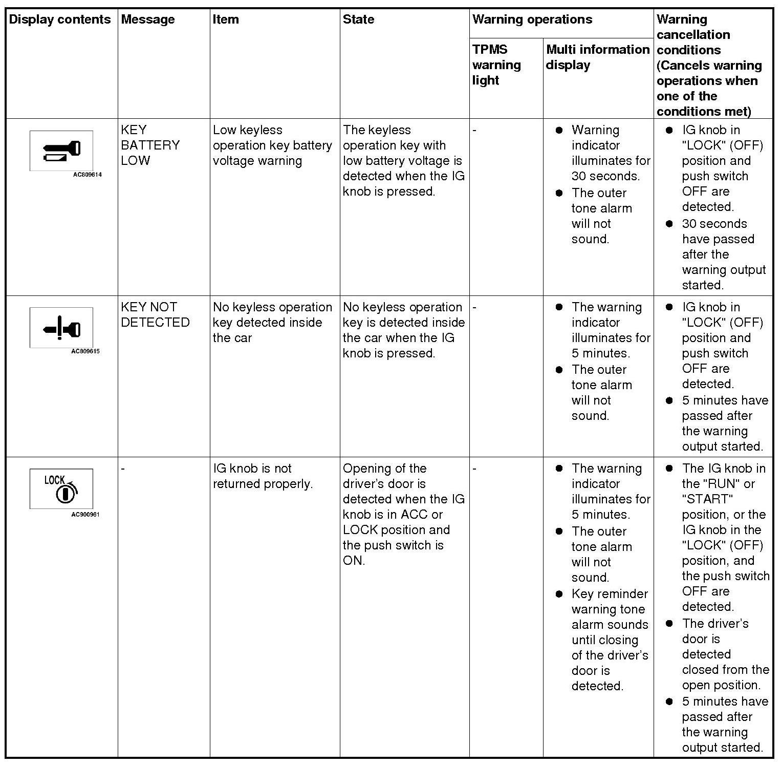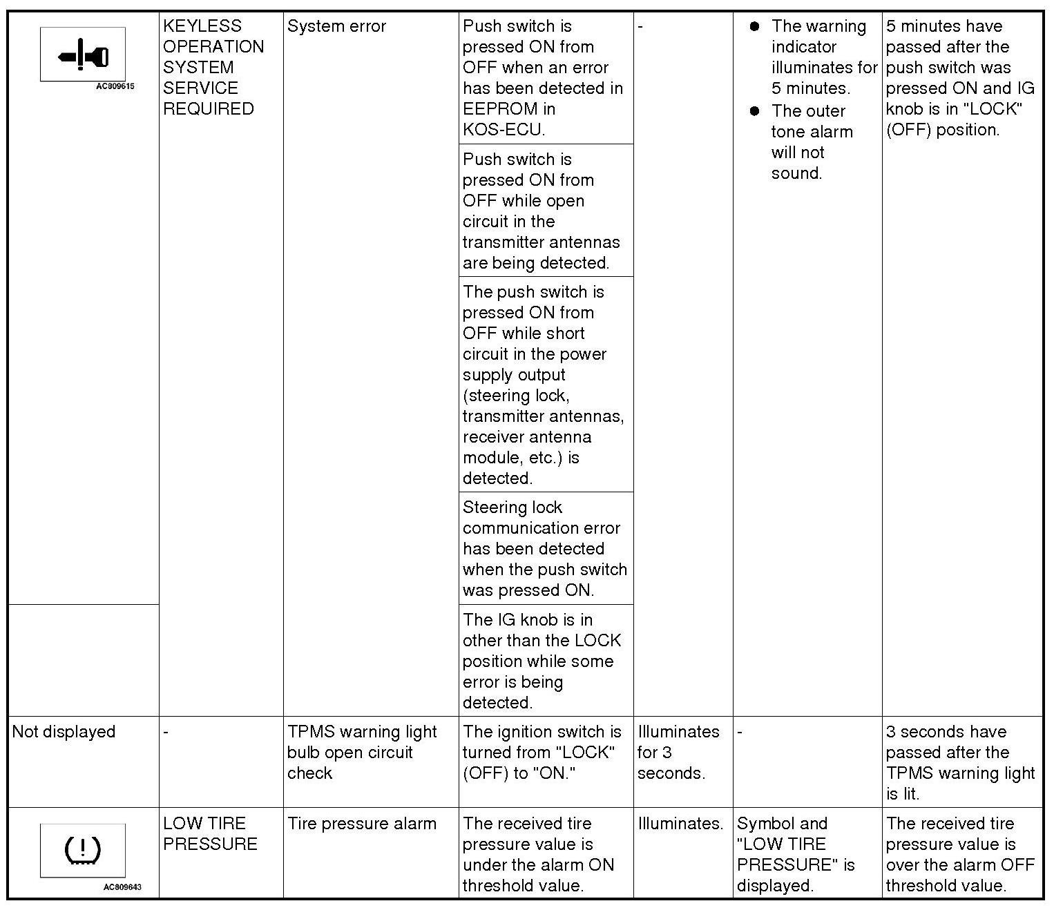 If the KOS failed, operated improperly, KOS-ECU warns the driver of this by setting off the outer tone alarm and the keyless operation warning indicator, on the multi information display in the combination meter. If the TPMS fails or the tire pressure is low, KOS-ECU warns the driver of that state by the TPMS warning light and the multi information display in the combination meter.
