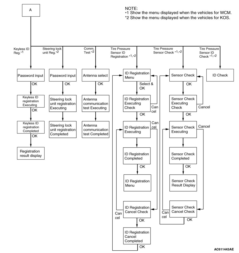 By operating the scan tool MB991958 (M.U.T.-III sub assembly) screen, the ID code registration and the TPMS can be registered and antenna communication required to the keyless operation system can be performed. KOS and keyless operation key are indicated as F.A.S.T and F.A.S.T.-key respectively in the scan tool MB991958 (M.U.T.-III sub assembly) screen.