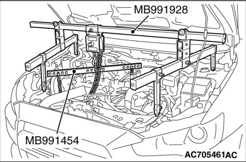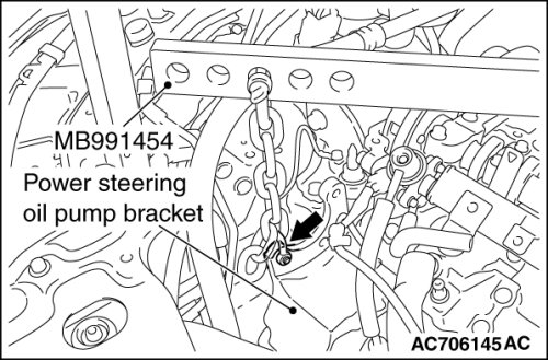 (3) Mount special tool MB991454 to the power steering oil pump bracket and the engine hanger, and set it to special tool MB991928 to support the engine and transaxle assembly.