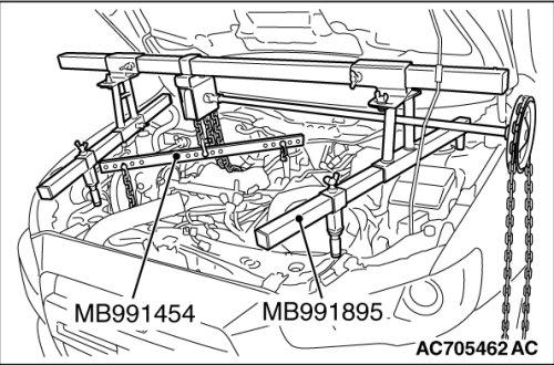 (2) Mount special tool MB991454 to the power steering oil pump bracket and the engine hanger, and set it to special tool MB991895 to support the engine and transaxle assembly.