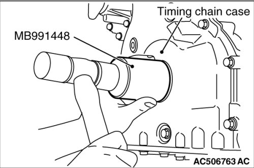 Using special tool MB991448, press in the crankshaft front oil seal up to the chamfered surface of timing chain case.