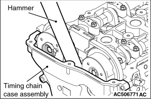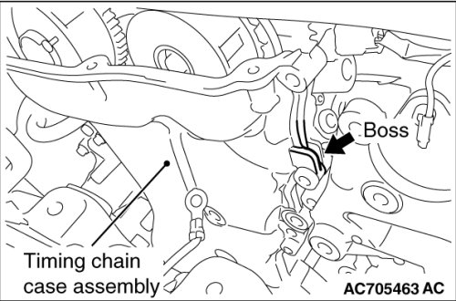 If the adhesive strength of sealant on the timing chain case assembly is so strong that the boss may be damaged by peeling off, do not peel it off forcibly.