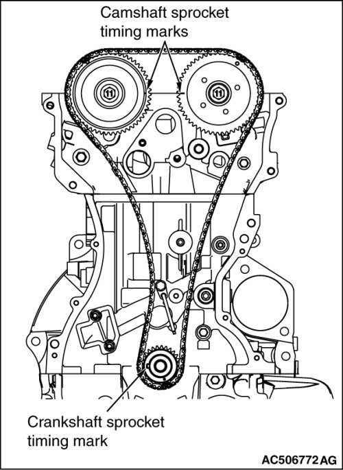 1. Set the timing marks of the camshaft sprockets and the crankshaft sprocket as shown in the figure.