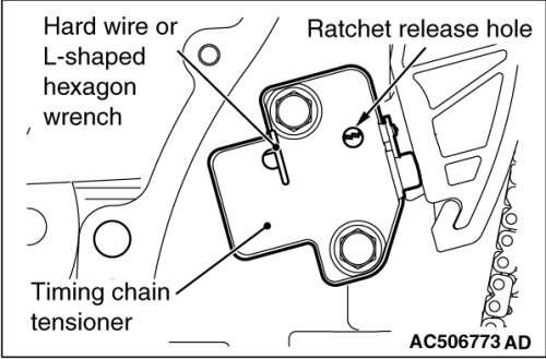 2. Remove the hard wire or L-shaped hexagon wrench fixing the plunger of the timing chain tensioner to apply tension to the timing chain.