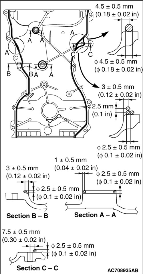 4. To the timing chain case assembly mating surface, apply the sealant with a width of 2.5 ± 0.5 mm (0.1 ± 0.02 inch) and without a gap. However, with the "A" shown in the figure, apply the sealant with overlapping the diameter of 4.5 ± 0.5 mm (0.18 ± 0.02 inch) or 2.5 ± 0.5 mm (0.1 ± 0.02 inch) as shown in the figure.