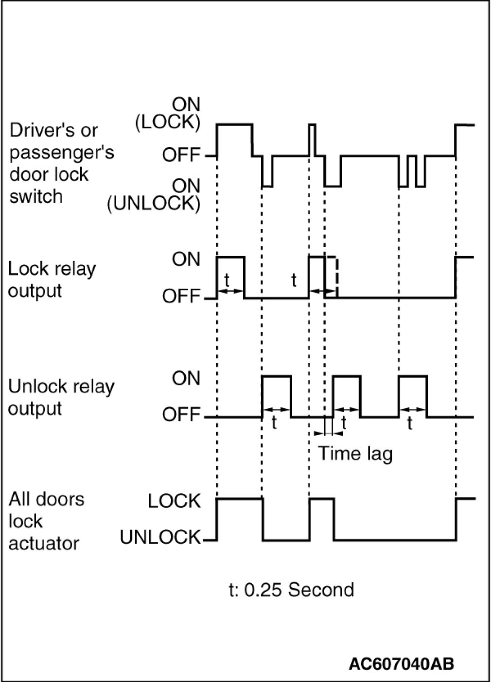 When the door is locked and unlocked by driver's or passenger's door lock switch consecutively, the ETACS-ECU operates its door lock relay and passes a current through the door lock actuators of all the doors for 0.25 second to lock all the doors. Then, the ETACS-ECU operates its door unlock relay and passes a current through the door lock actuators of all the doors for 0.25 second to unlock all the doors. Due to this, there may be a time lag between the driver's or passenger's door lock switch actuation and the time when all the doors are unlocked.