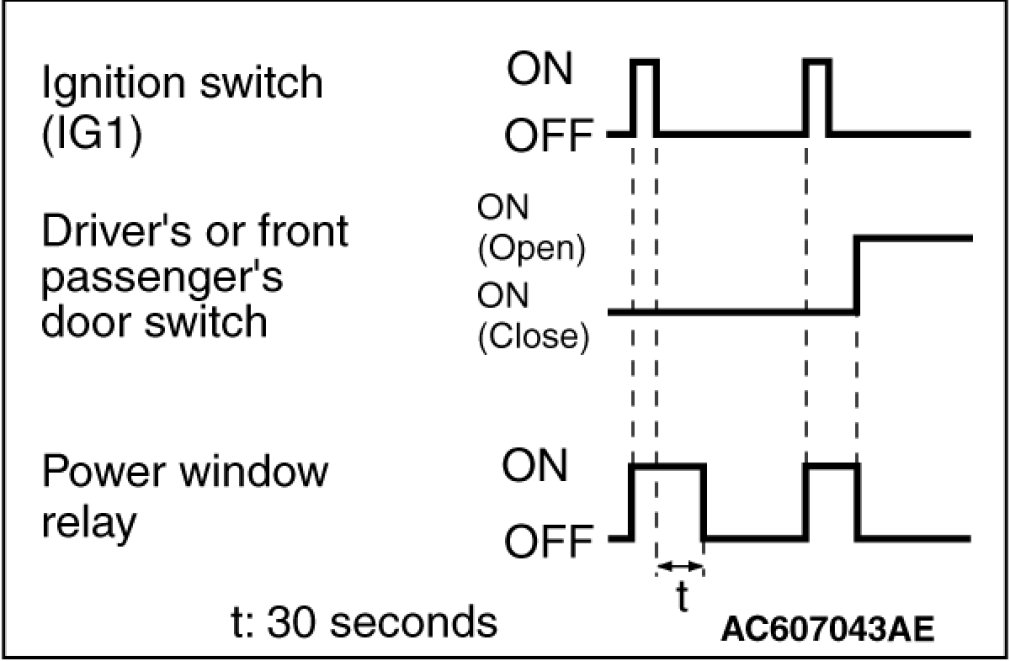 Even after the ignition is switched off, the ETACS-ECU keeps the power window relay activated for approximately 30 seconds, enabling raising or lowering of the power windows by using the power window switches (timer function). After approximately 30 seconds, the power window relay is deactivated.
