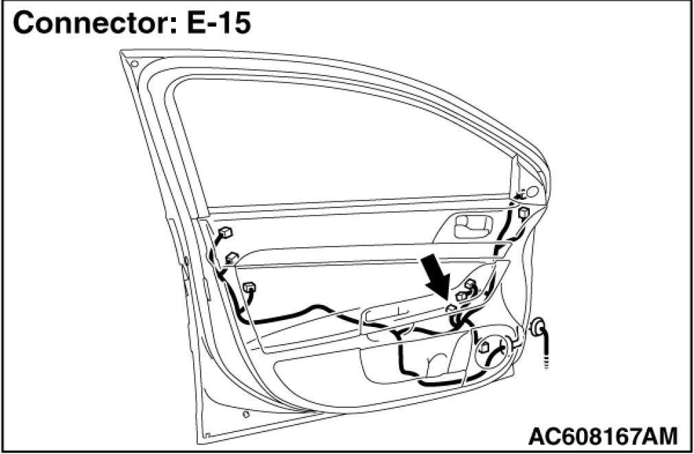 (1)Disconnect power window main switch connector E-15 and measure the voltage available at the wiring harness side of the connector.