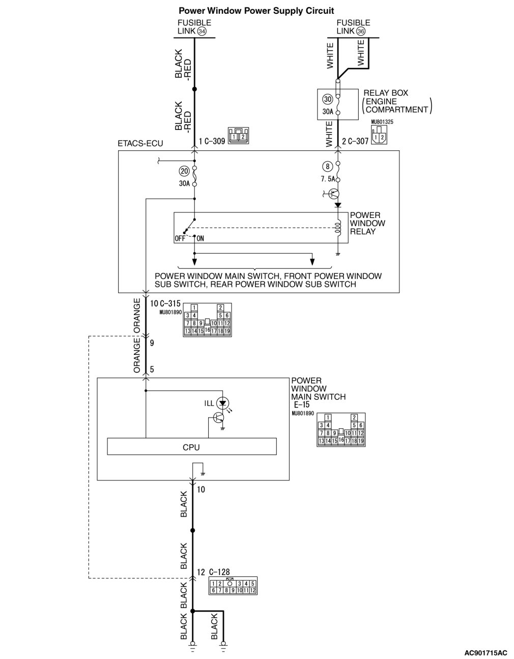 STEP 11. Check the ETACS-ECU connector C-315 line circuit to the power window main switch. Measure the voltage at power window main switch connector E-15.