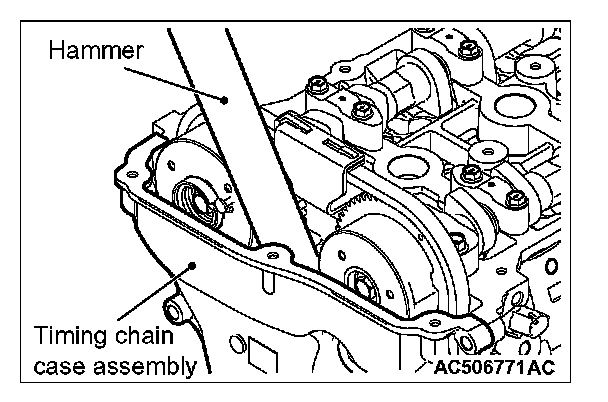1. After removing the timing chain case assembly mounting bolts, slightly pry the boss of the timing chain case assembly shown in the figure using a flat-tipped screwdriver, and remove the timing chain case assembly from the cylinder head and cylinder block.