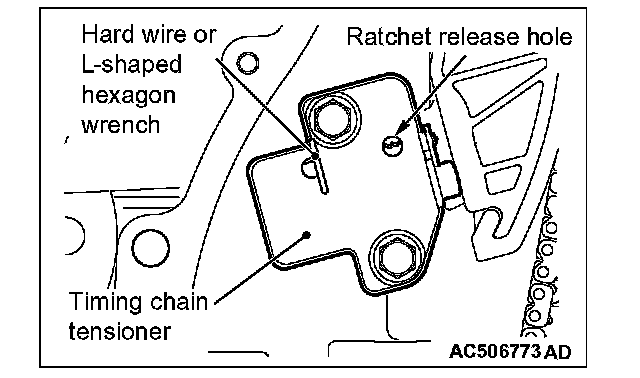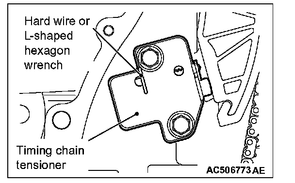 2. Remove the hard wire or L-shaped hexagon wrench fixing the plunger of the timing chain tensioner to apply tension to the timing chain.