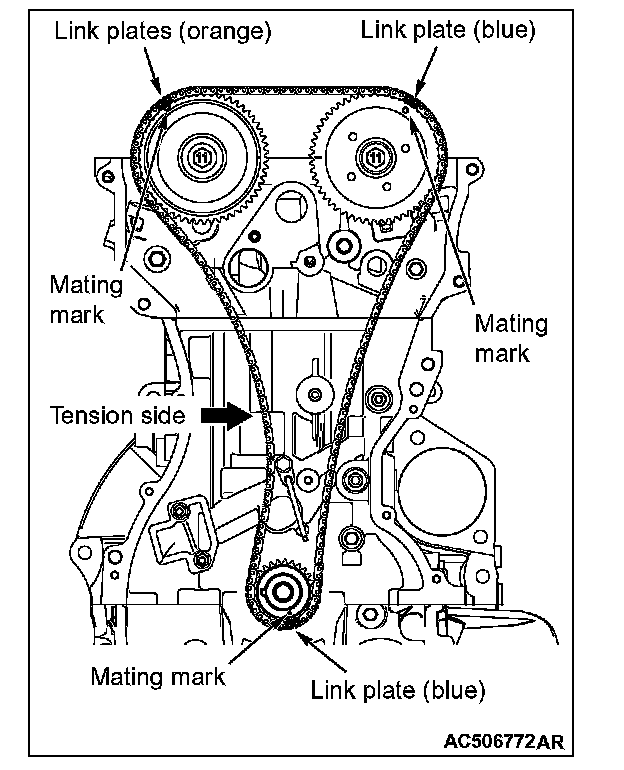 2. Align each sprocket timing chain mating marks with the link plate (orange or blue) of timing chain to avoid slack of the timing chain tension side, and install the timing chain to the sprockets.