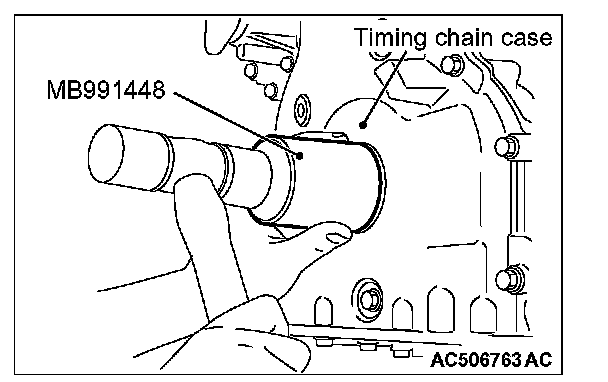 2. Using special tool MB991448, press in the crankshaft front oil seal up to the chamfered surface of timing chain case.