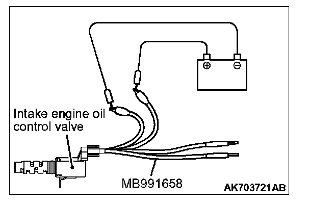 2. Check that the operation sound of the intake engine oil control valve can be heard when the positive battery voltage is supplied to the intake engine oil control valve. (Use the special tool MB991658 to connect terminal No. 2 of the intake engine oil control valve connector to the positive battery terminal and terminal No. 1 to the negative battery terminal.)