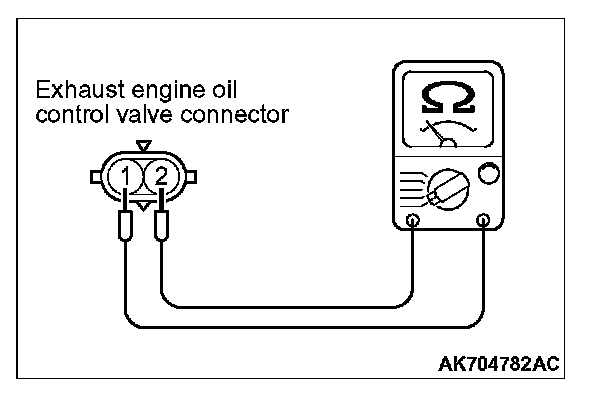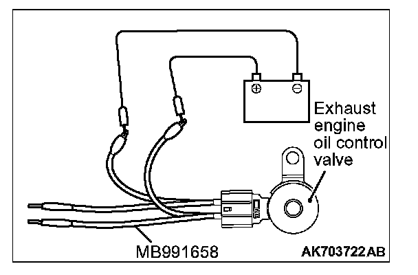 2. Check that the operation sound of the exhaust engine oil control valve can be heard when the positive battery voltage is supplied to the exhaust engine oil control valve. (Use the special tool MB991658 to connect terminal No. 2 of the exhaust engine oil control valve connector to the positive battery terminal and terminal No. 1 to the negative battery terminal.)