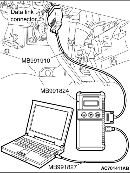 1. Connect scan tool MB991958 to the data link connector.