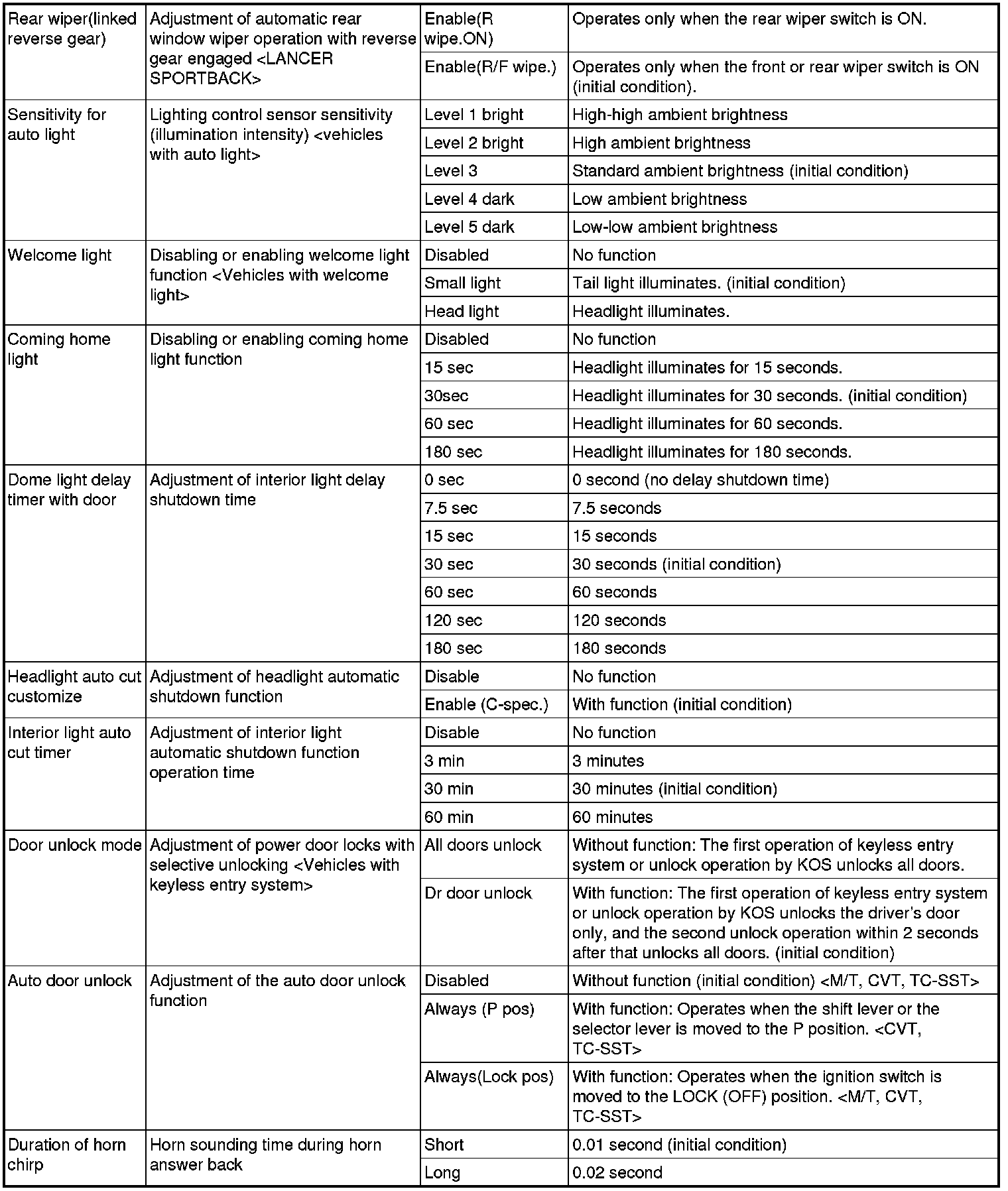 By operating the ETACS system or MMCS of scan tool MB991958, the following functions can be programmed. The programmed information is held even when the battery is disconnected.