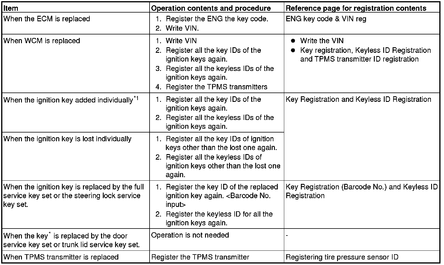 The transponder (a small transmitter) in the ignition key, WCM, and the ECM have their own ID codes stored in them. When the cases listed in the table below occur, the ID codes must be registered in the WCM or ECM again.