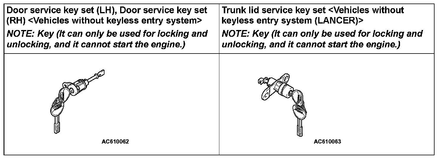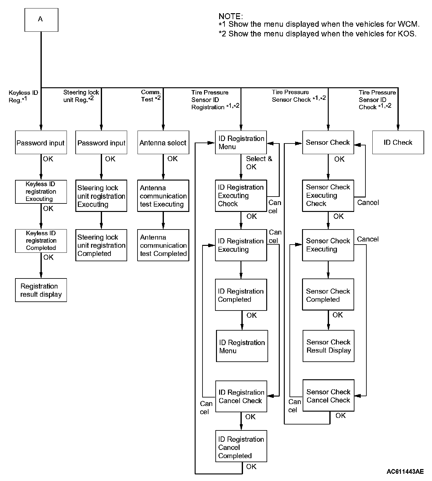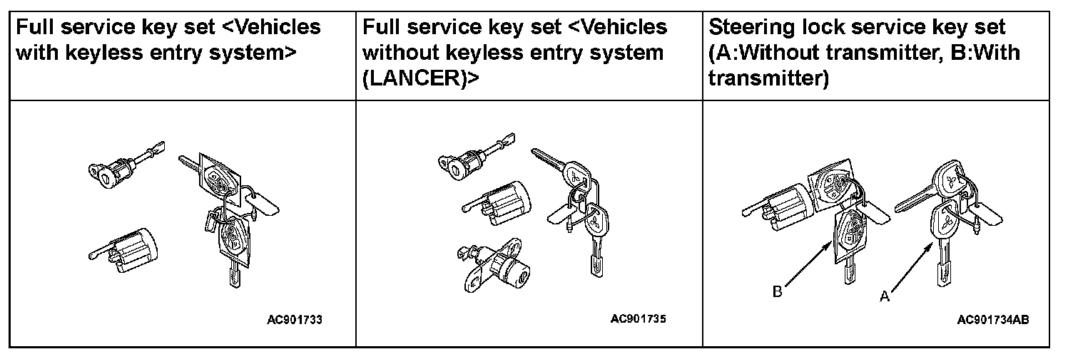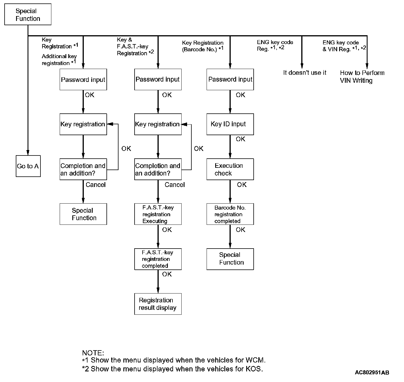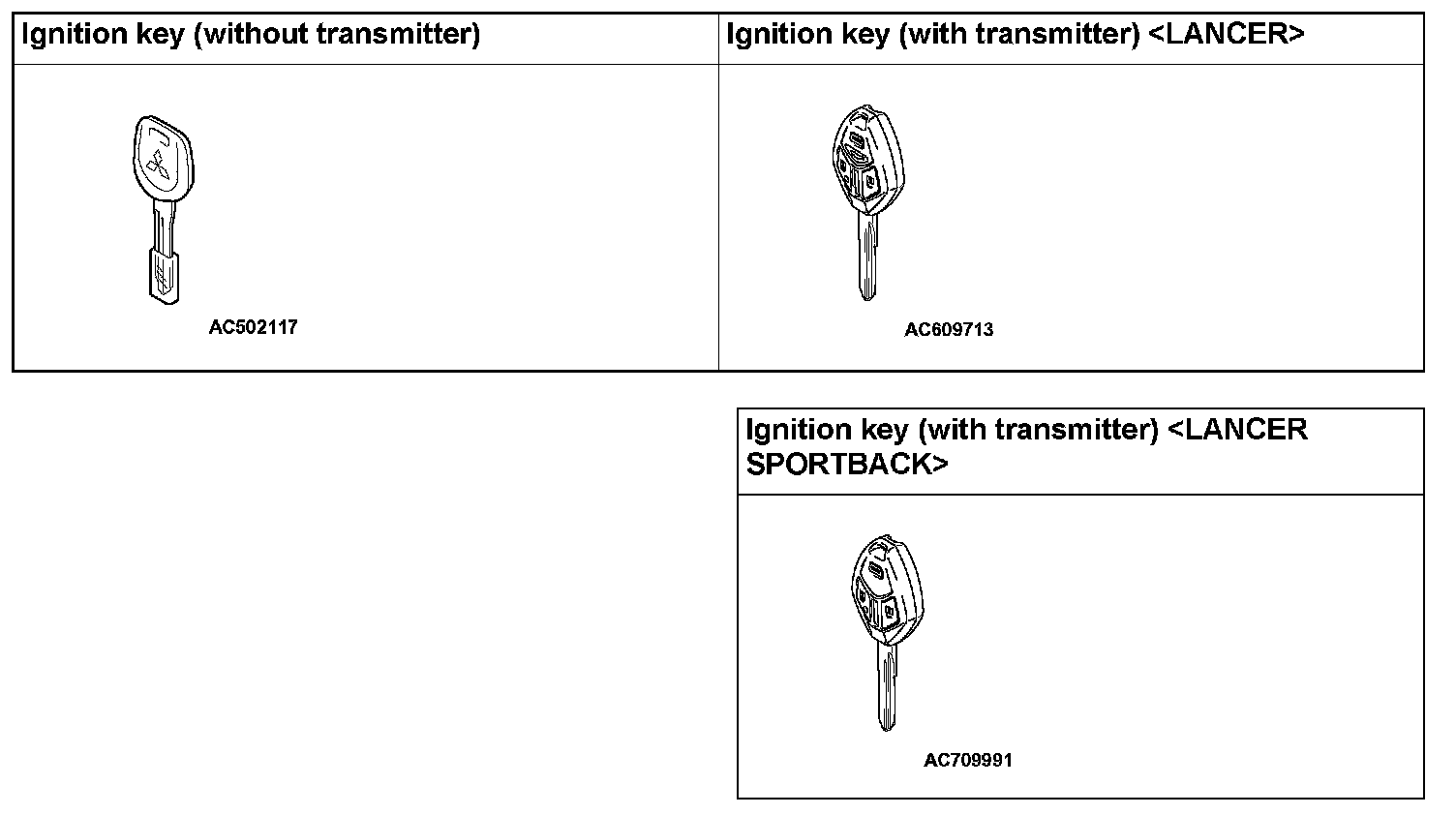 The ID codes necessary for the engine immobilizer system, the keyless entry system and the TPMS can be registered using the scan tool MB991958 (M.U.T.-III sub assembly). KOS and keyless operation key are indicated as F.A.S.T and F.A.S.T.-key respectively in the scan tool MB991958 (M.U.T.-III sub assembly) screen.