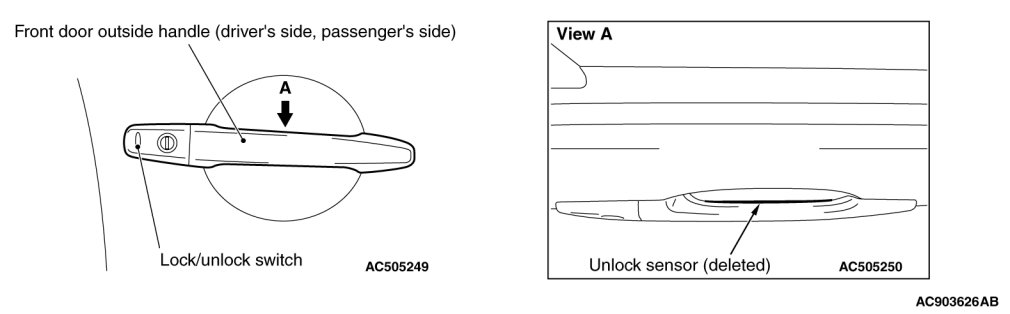 The keyless operation key and KOS-ECU communicate to certify the keyless operation key when the lock/unlock switch on the driver-side/front passenger-side door outside handle or the liftgate lock release handle (lock switch) [LANCER SPORTBACK]