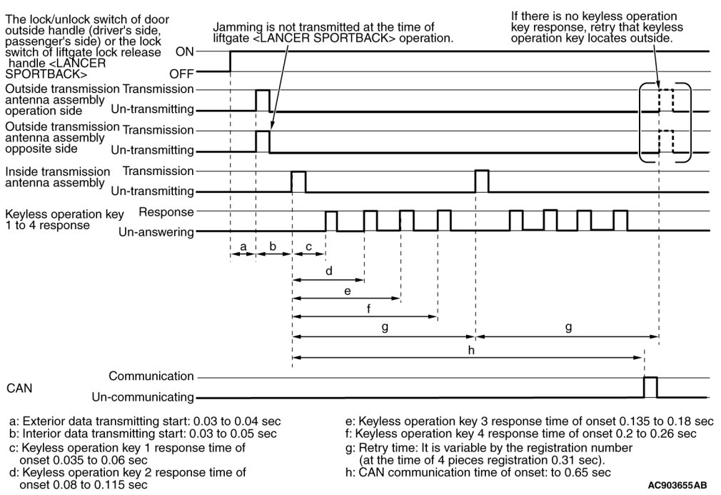 is turned ON. When KOS-ECU certifies the registered keyless operation key only on the outer side of the vehicle, it requests ETACS-ECU to lock all the doors and the liftgate [LANCER SPORTBACK].