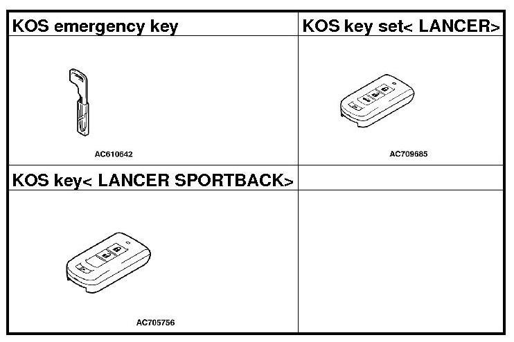 By operating the scan tool MB991958 (M.U.T.-III sub assembly) screen, the ID code registration and the TPMS can be registered and antenna communication required to the keyless operation system can be performed. KOS and keyless operation key are indicated as F.A.S.T and F.A.S.T.-key respectively in the scan tool MB991958 (M.U.T.-III sub assembly) screen.