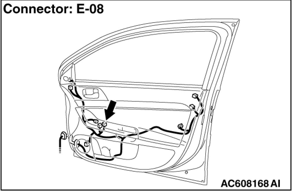 STEP 2. Check front power window sub switch connector E-08 for loose, corroded or damaged terminals, or terminals pushed back in the connector.