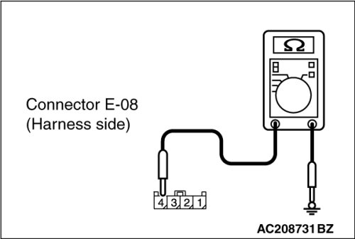 (1)Disconnect front power window sub switch connector E-08 and measure the resistance available at the wiring harness side of the connector.
