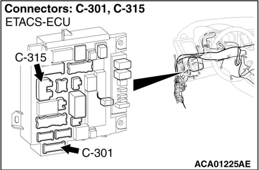 STEP 6. Check ETACS-ECU connector C-301 and C-315 for loose, corroded, damaged terminals or terminals pushed back in the connector.