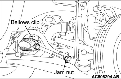 1. Adjust the toe-in by undoing the bellows clip and jam nut, and turning the left and right tie rod turnbuckles by the same amount (in opposite directions).