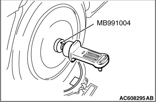 For vehicles with aluminum type wheels, attach the camber/caster/kingpin gauge to the driveshaft by using the special tool MB991004. Tighten the special tool MB991004 to the same torque 144 - 176 Nm (106 - 130 ft-lb) as the driveshaft nut.